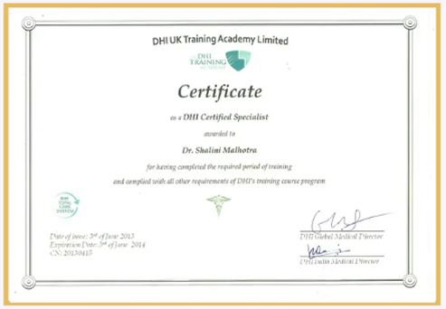 - Advanced hair transplant training at DHI Academy, Greece; served as Master Surgeon for over four years