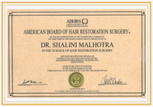 Dr. Shalini Malhotra has extensive international and national experience in hair restoration. She worked as a Master Surgeon for the DHI group of clinics in Greece for several years, honing advanced FUE techniques. She is also a Diplomate of the ABHRS and was the first Indian elected to its Board of Directors (2020–2023), serving as an examiner for candidates pursuing ABHRS certification worldwide.